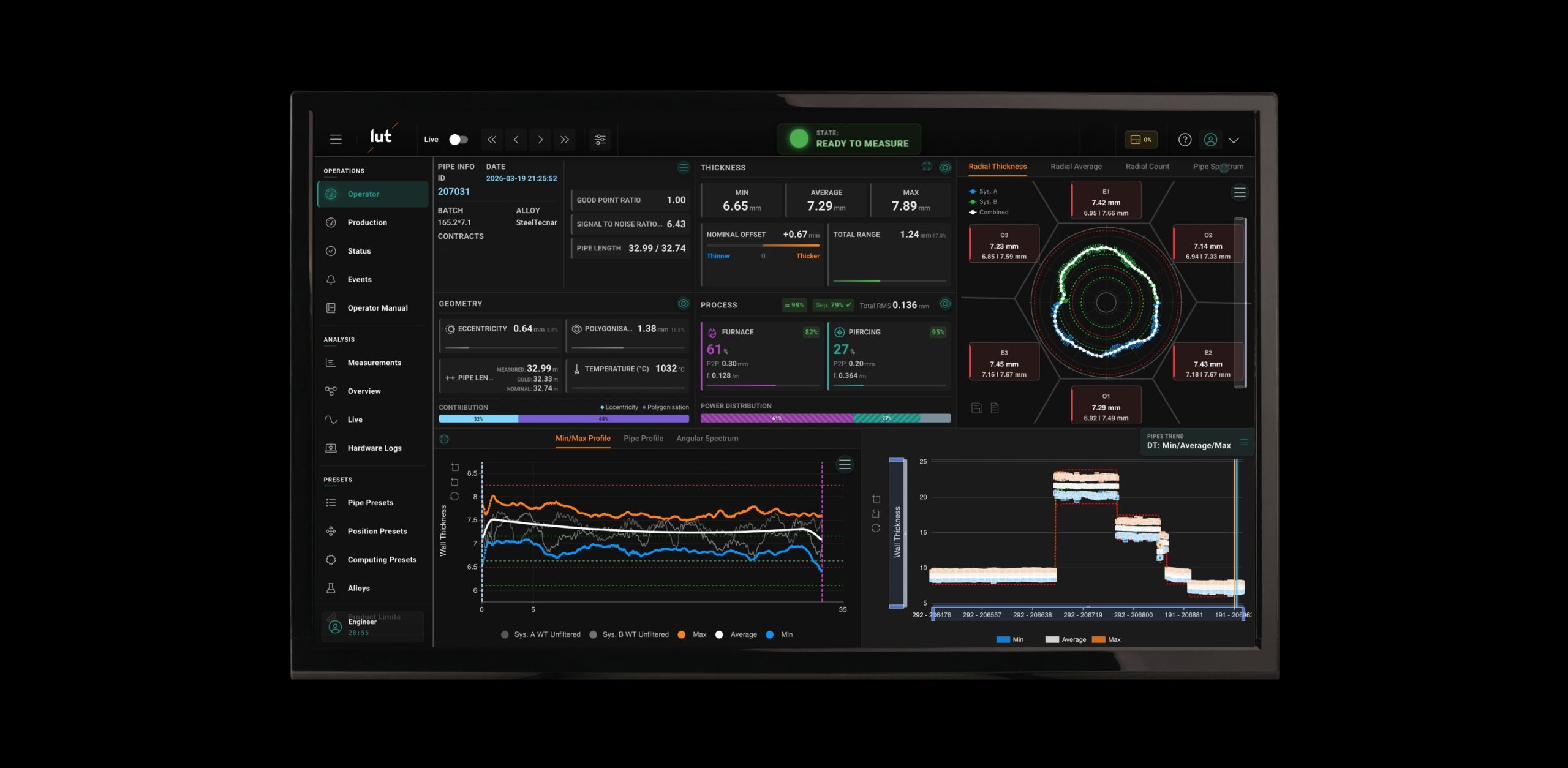 The Lut 3.0 Digital Twin builds a complete, real-time replica of every pipe using high-resolution measurements taken along its length and across its circumference. It separates and analyzes each source of variation—whether from temperature, piercing, or forming—so nothing is hidden.