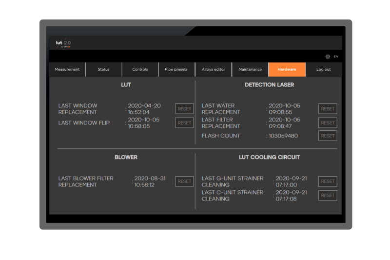 Lut 2.0 software constantly monitors hundreds of metrics to keep track of hardware performance. If any issue arises, the user is immediately alerted and the intuitive software interface guides them through a troubleshooting sequence to solve the problem as quickly as possible. In addition, the Lut software will prompt users when consumables are at the end of their lifecycle and need to be replaced.