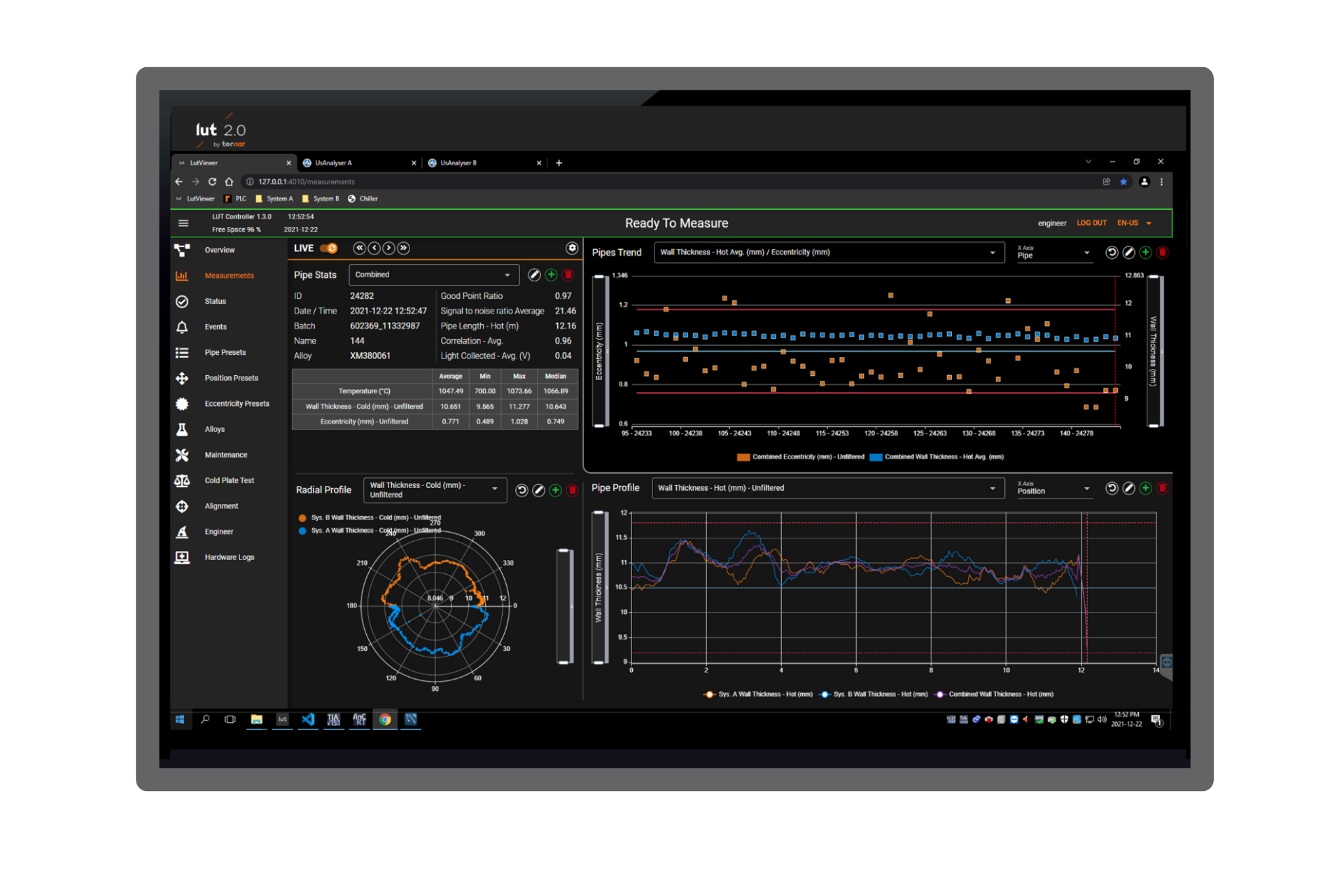 The Lut 2.0 has a direct interface with the plant network. Within a few seconds of leaving the probe location, the tube data is available for process control. This information is seamlessly transferred to the mill via the Lut database and can be used to correct any deviation in tube’s thickness and geometry.